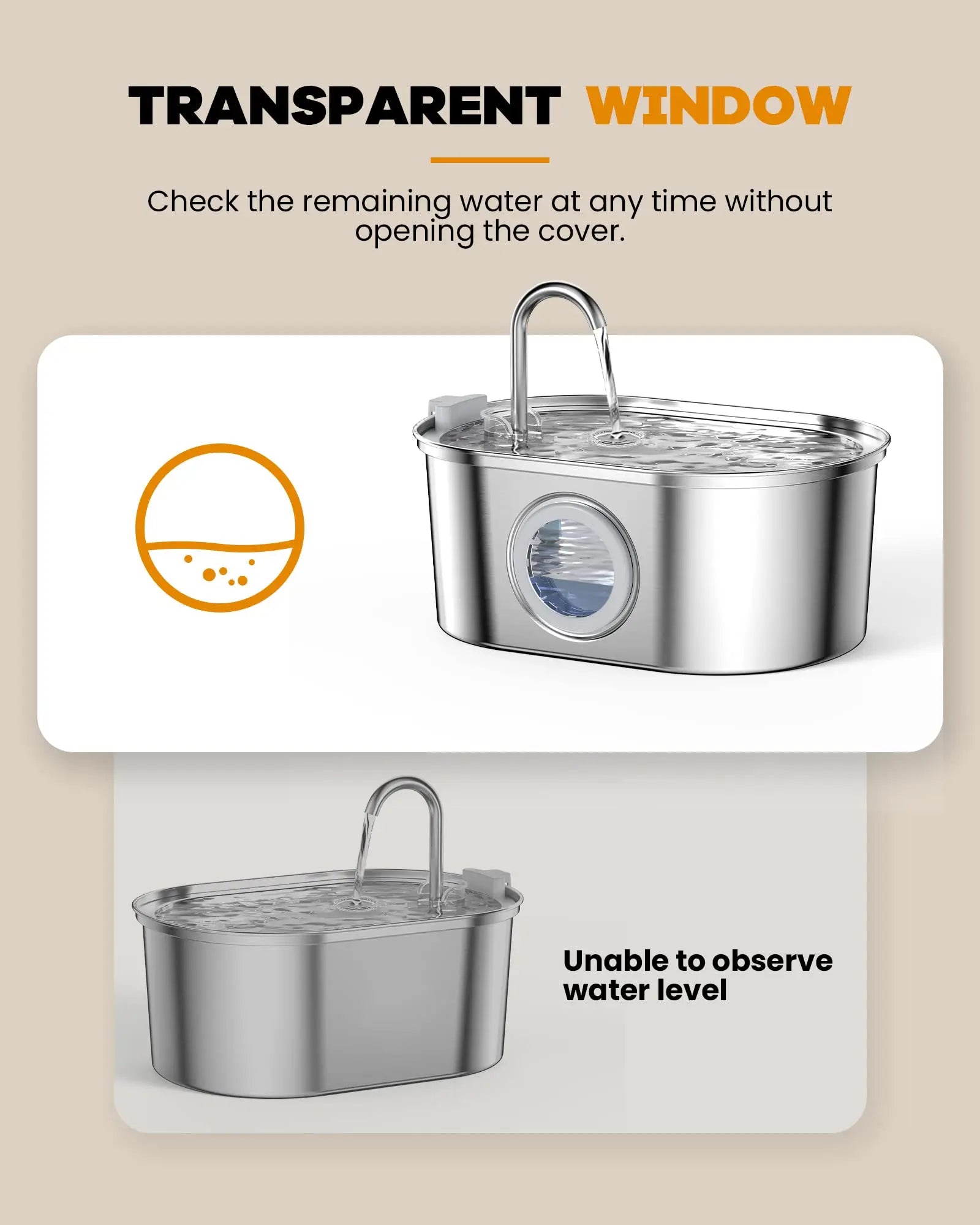 😺【Unique Design: Water Level Window and Stainless Steel】 A transparent round window is designed on the stainless steel cat water fountain, you can view the water level of the cat water fountain without opening the cat fountain. The cat fountain is made of high quality 304 stainless steel, which is corrosion resistant.