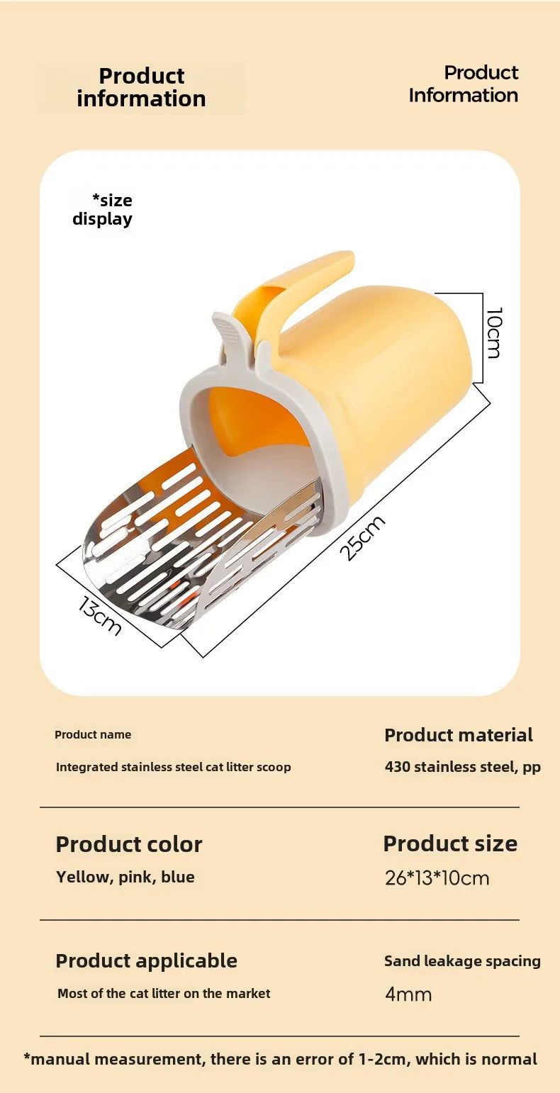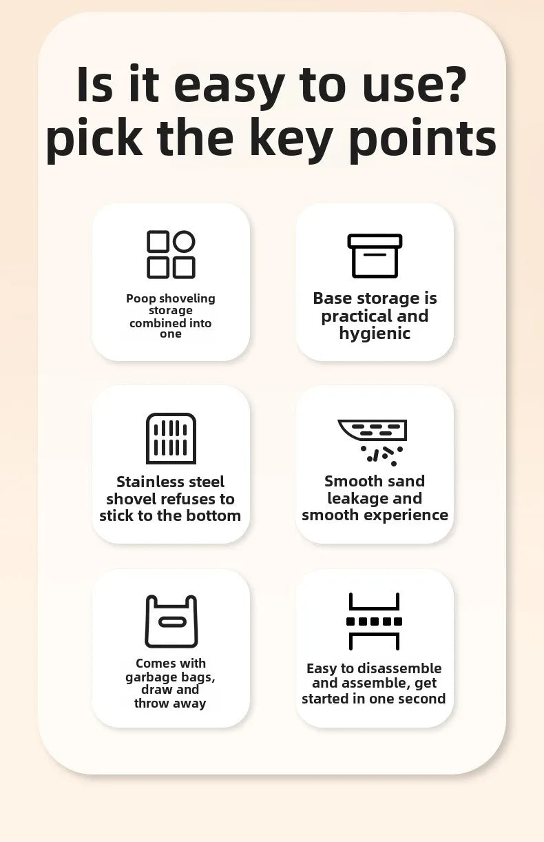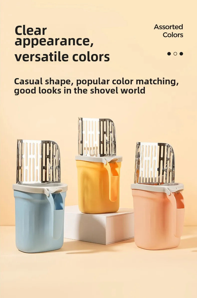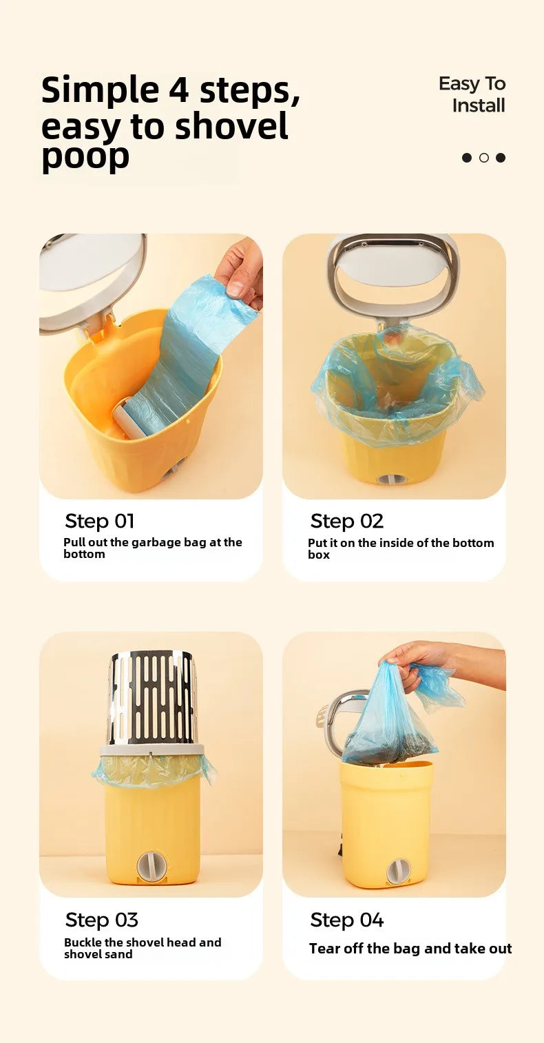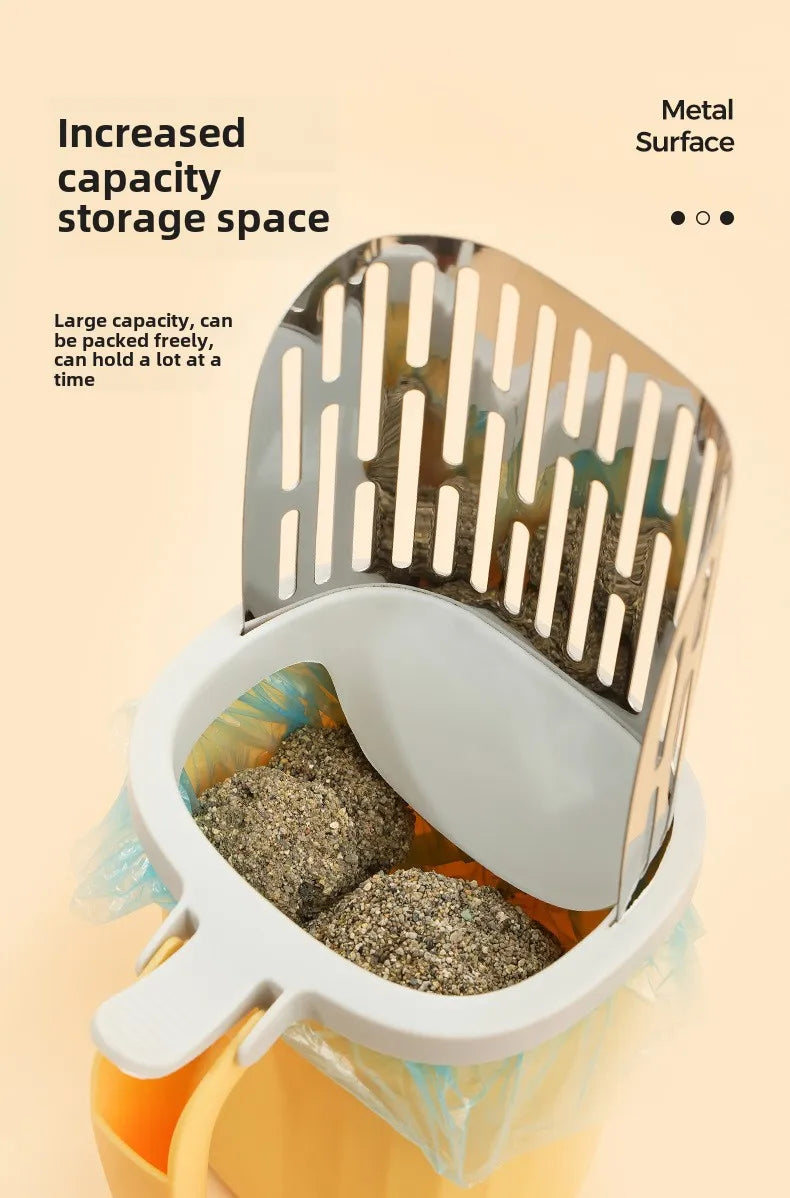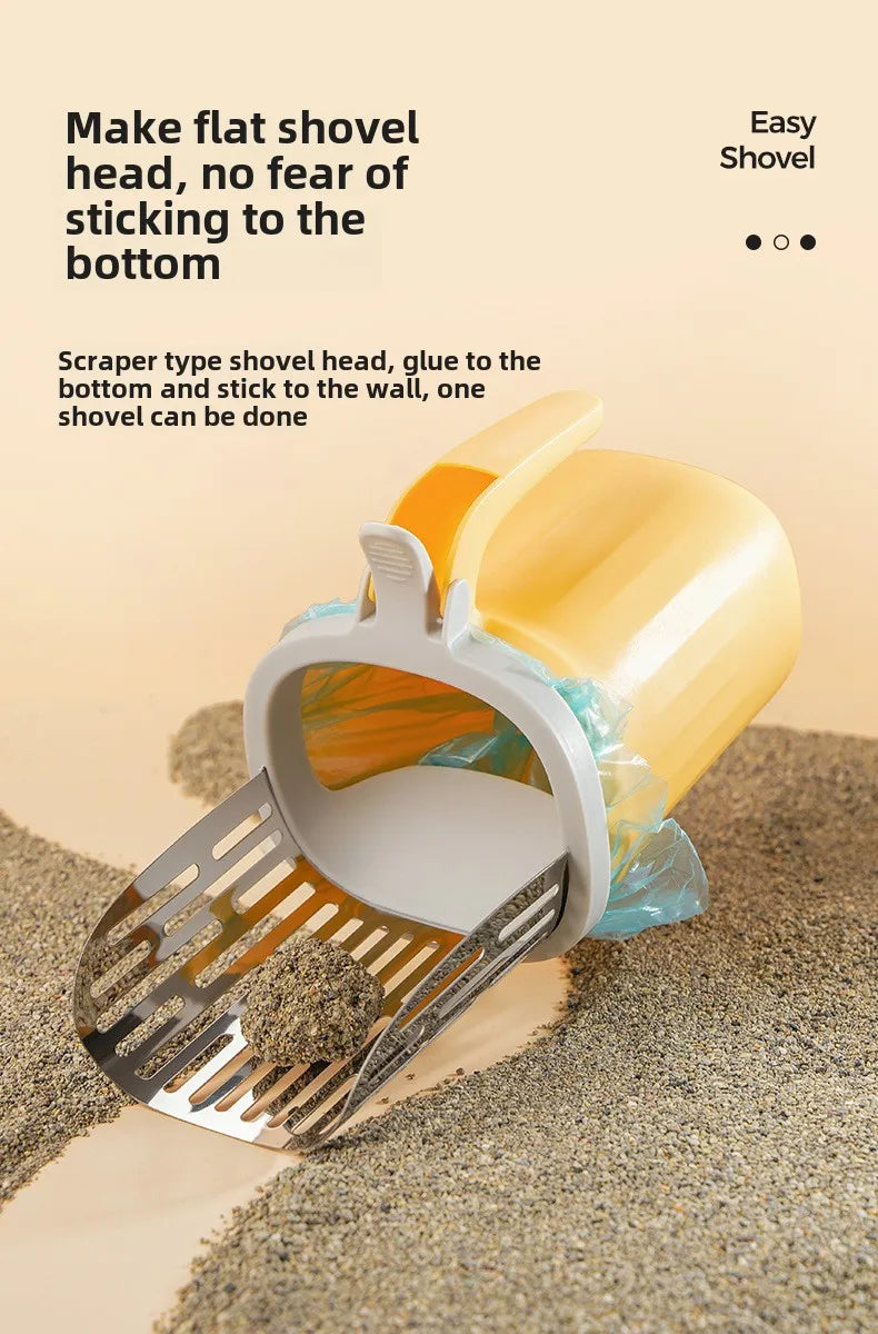 Features: 1.This cat litter scoop comes with a trash can, which is convenient and time-saving for cleaning. 2. With large and enough capacity, it can hold a certain amount of cat litter. 3. The bottom can place the litter bag directly. After being filled, it can be removed easily. 4. It can filter the cat litter easily, avoiding waste.