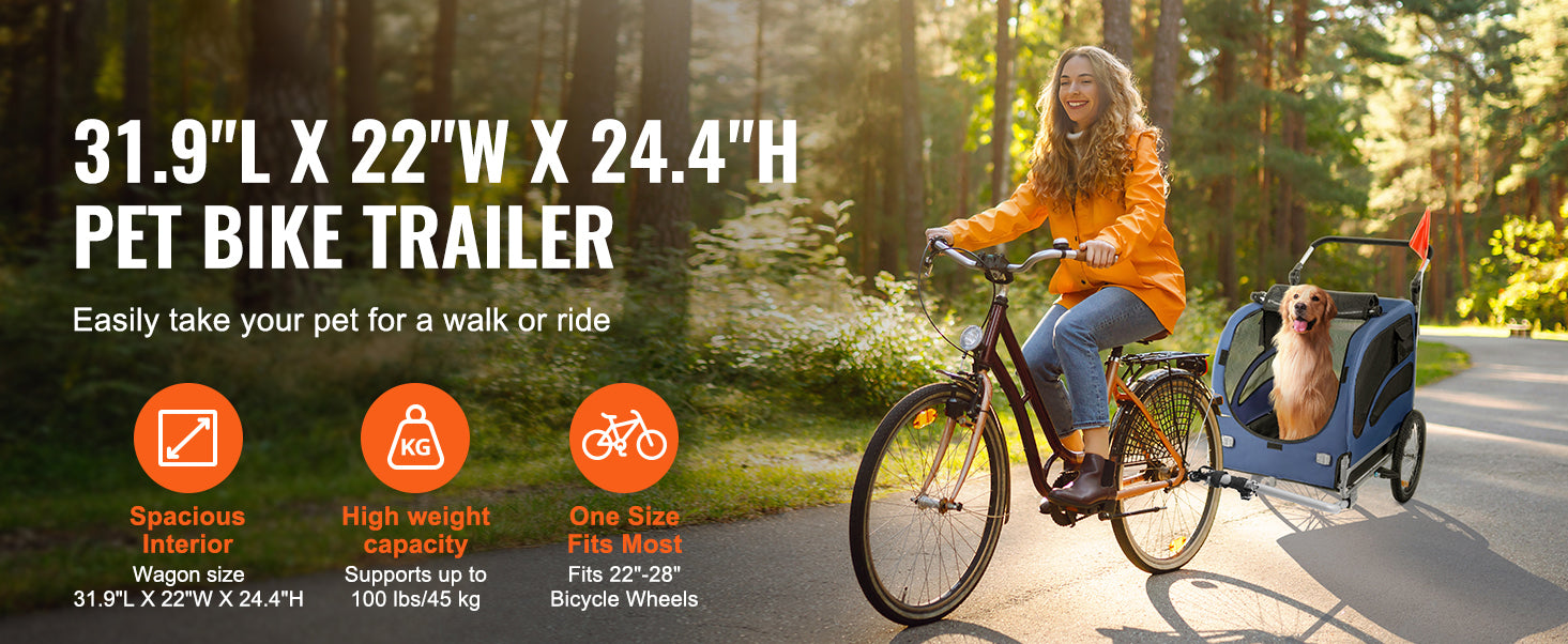 Spacious Pet Bicycle Trailer:This dog bike trailer offers a generous compartment for your pet to relax during your rides. It’s ideal for medium-sized dogs or several smaller ones up to 24" in height, accommodating a maximum weight of 100 lbs (45 kg).