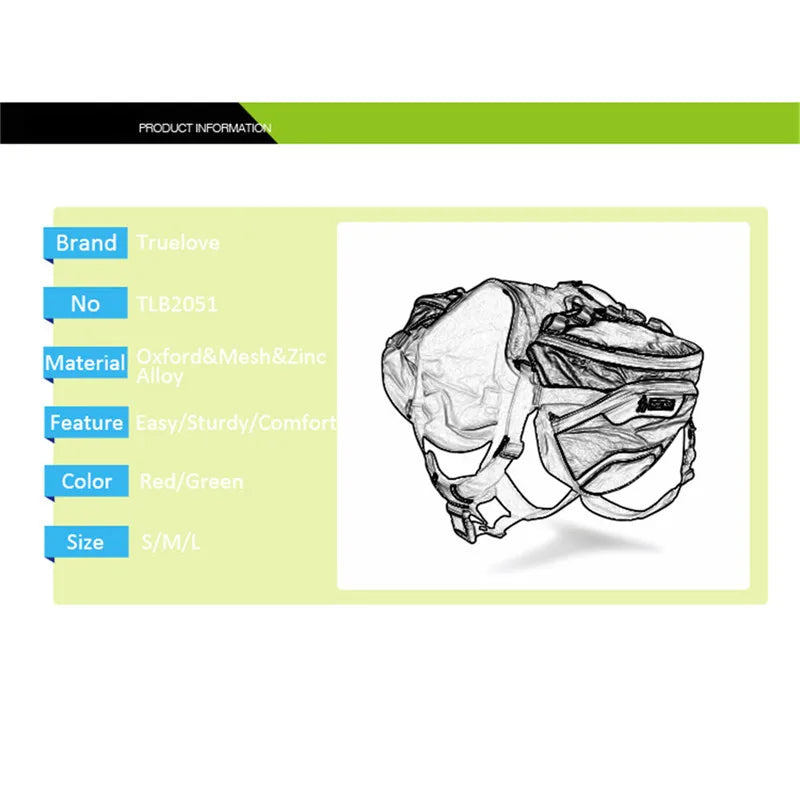 waterproof oxford,SBS waterproof reversed coil zipper,lightweight sandwish mesh lining,soft sponge padding,plastic buckle, Metal D-ring,reflective,detachable(harness and bag)